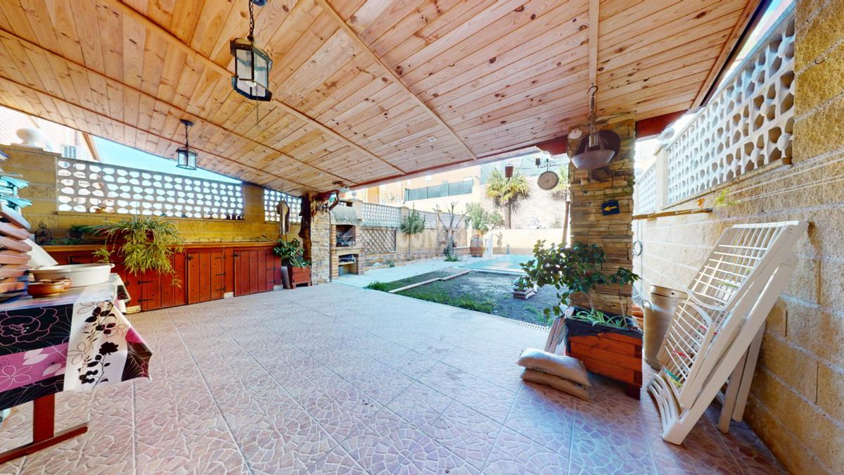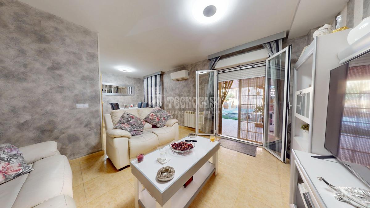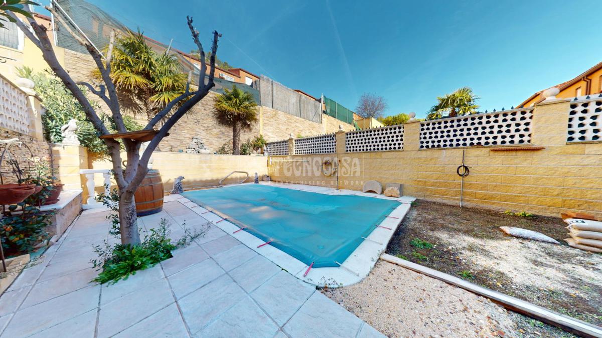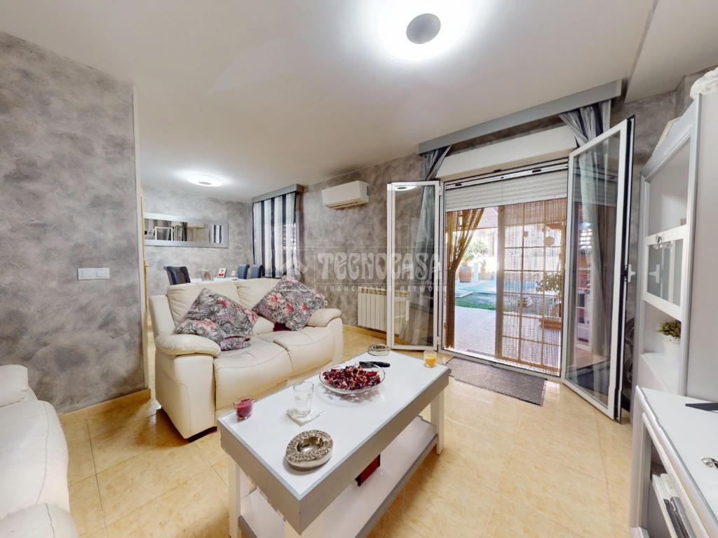- En planta baja encontramos un gran hall recibidor con acceso a cocina totalmente amueblada de buenas dimensiones con espacio para office, aseo con ventana, gran salón independiente con aire acondicionado, muy luminoso con acceso directo al patio, el cual cuenta con un gran porche totalmente acondicionado para el verano, también cuenta con una gran piscina de 17m2 aprox en perfectas condiciones.