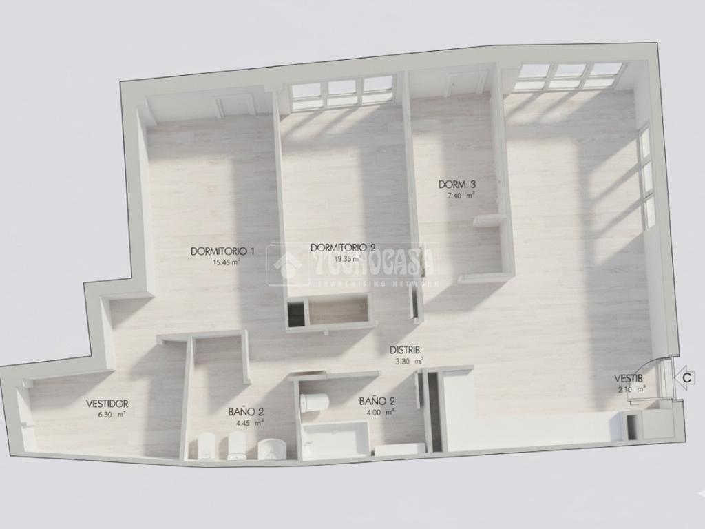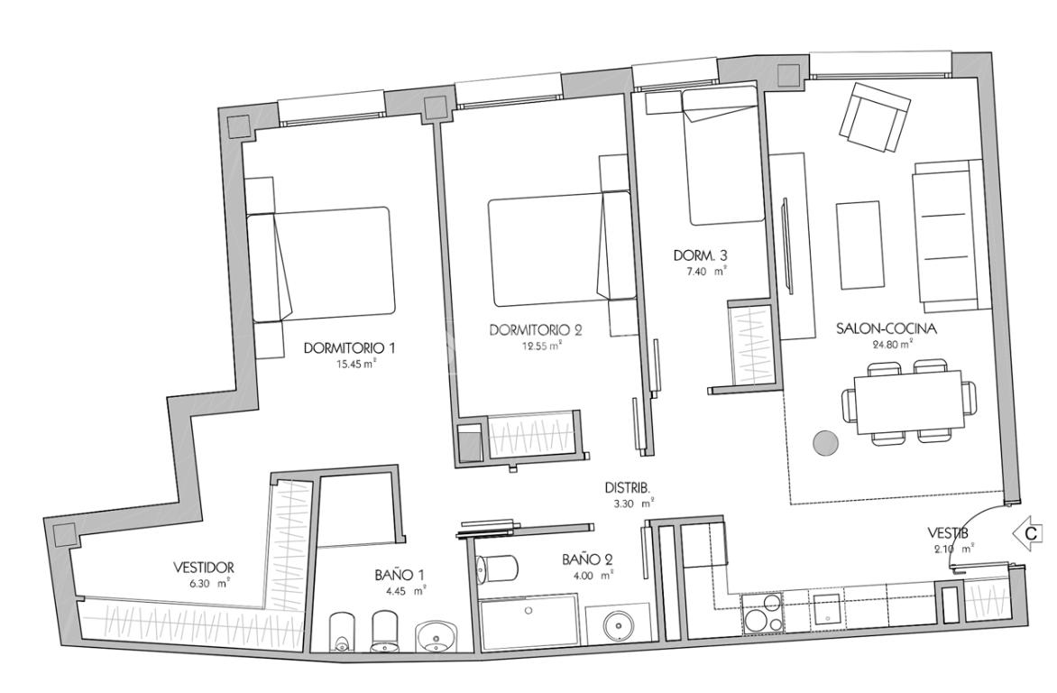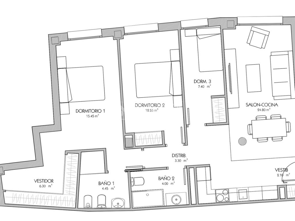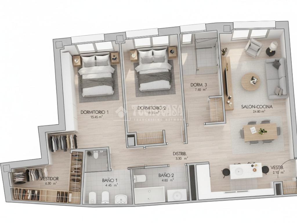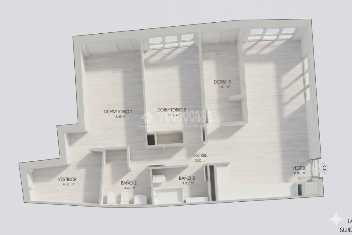 Fantástica vivienda de tres dormitorios, dos baños, vestidor, cocina y con una superficie bien aprovechada, destaca su amplio salón-comedor, perfecto para disfrutar de reuniones y momentos en familia.